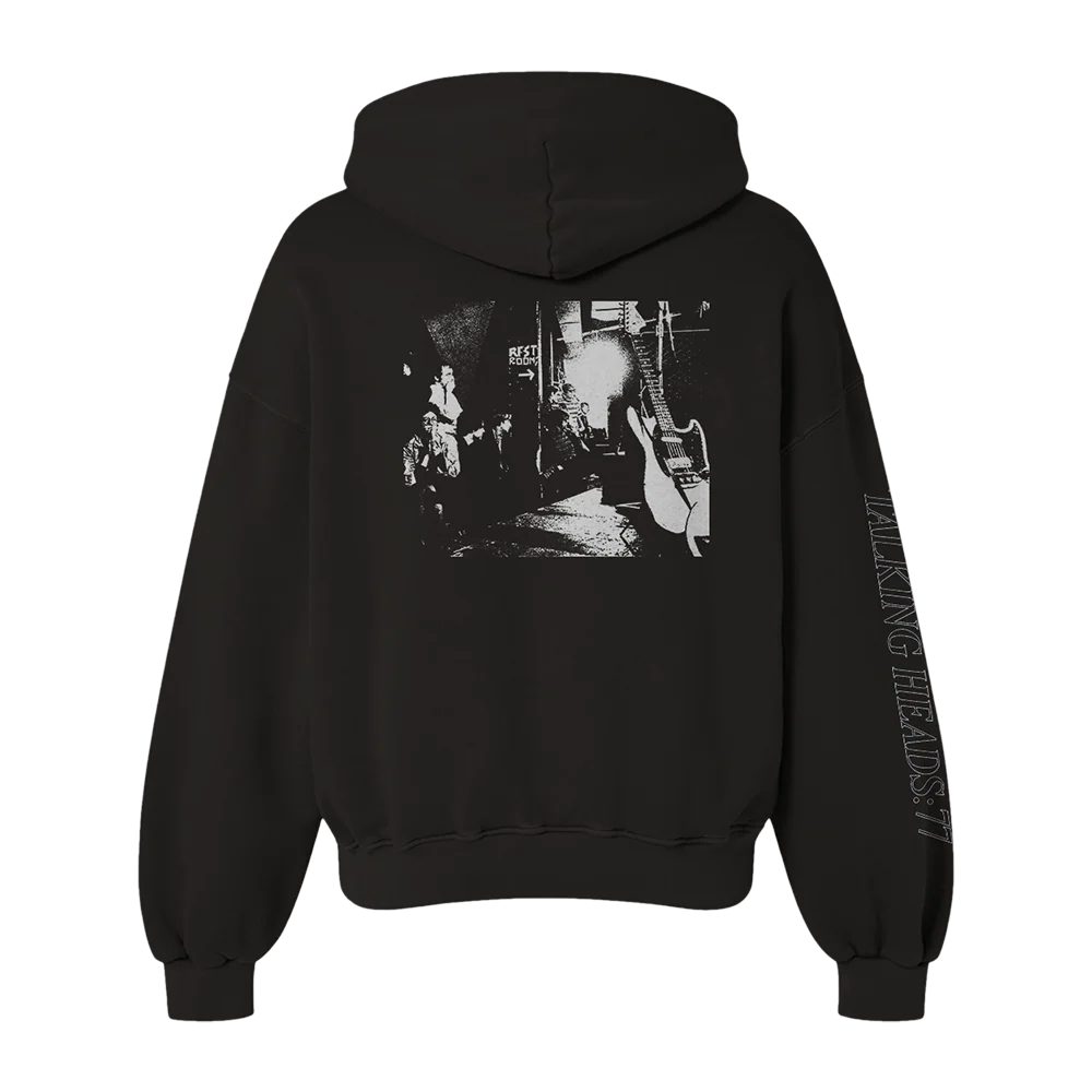 Black unisex fleece hooded sweatshirt with live Talking Heads images on the front and reverse and Talking Heads:77 sleeve hit.