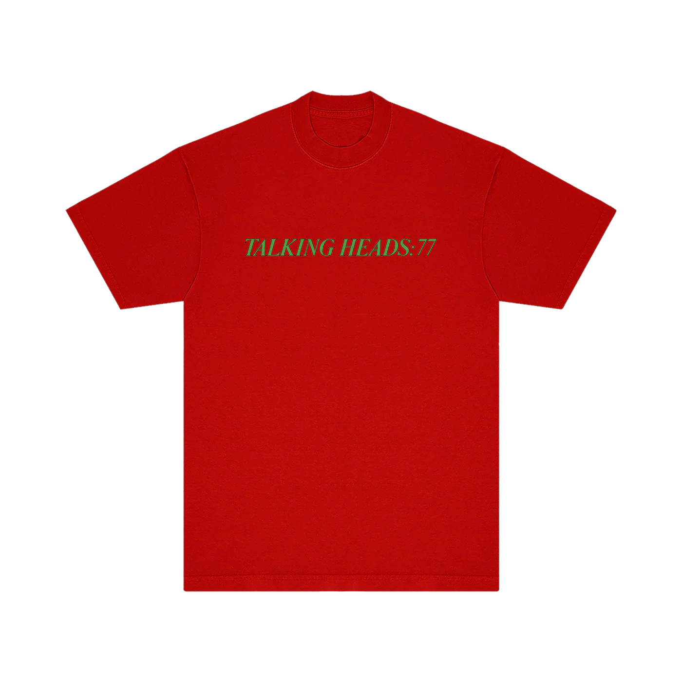 Black, unisex t-shirt with lime green Talking Heads:77 album logo on the front